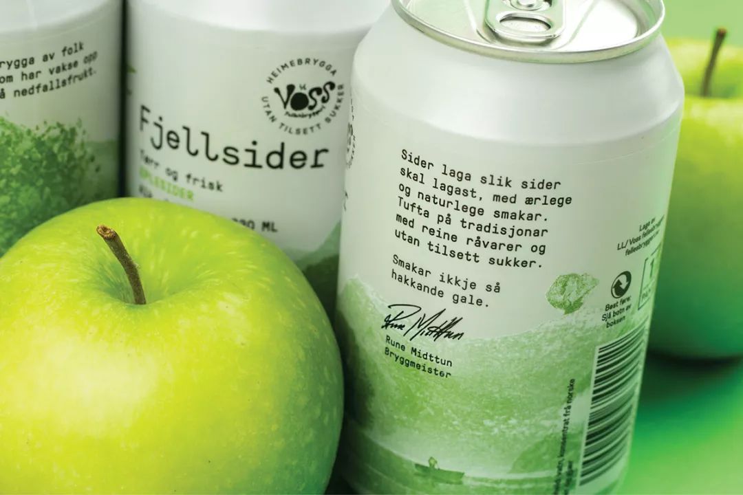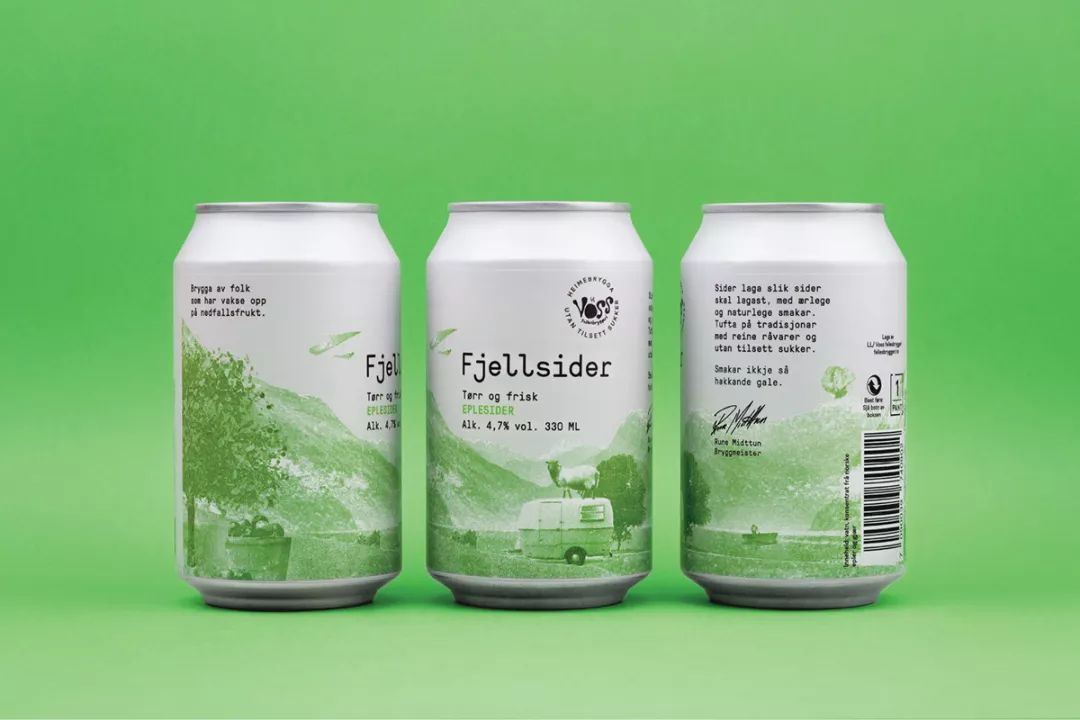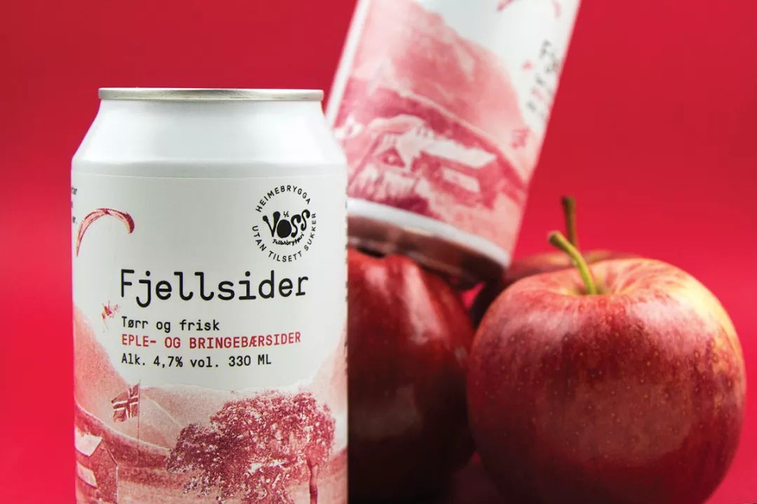 Voss Fjellsider 是一款蘋果酒品牌,挪威設計團隊為其設計的包裝,設計師為包裝繪出一組山間風景插畫,使用絲印的工藝制作而成,畫面以紅蘋果、青蘋果兩塊單色呈現,很好的呈現了酒與蘋果之間那種朦朧的感覺。