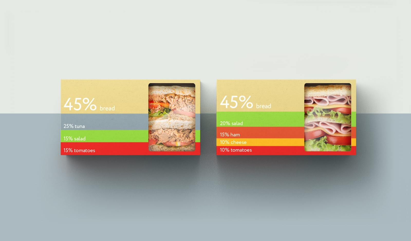 整體設計非常簡潔,大膽亮麗的色彩,在包裝上還標注了三明治中的營養成分,留白的“視覺窗口”將產品的原料展現在消費者眼前,給消費者創建了很好的觸覺體驗,使產品更加真材實料,給人留下一種奇特的心理感受。